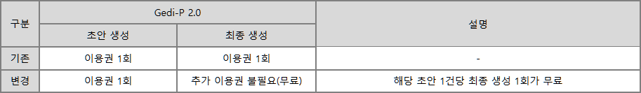 이를 통해 고객님들께서 더 많은 AI 생성 기회를 누리실 수 있게 되었습니다.※ 본 정책 변경은 2025년 10월 1일 이후 생성된 초안에 소급 적용되며, 해당 초안의 최종 생성 1회는 무료입니다.